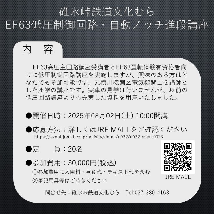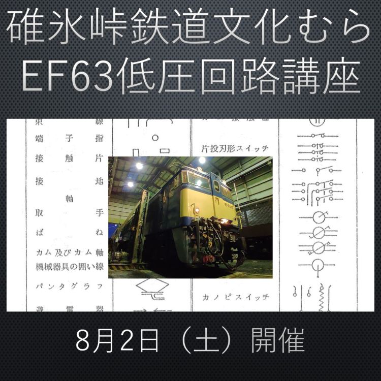 EF63形電気機関車の低圧制御回路講座を開催します。内容としてはかなり難しいものとなりますが、EF63運転体験資格がなくても申し込み可能です。皆様のお申込をお待ちしております。
