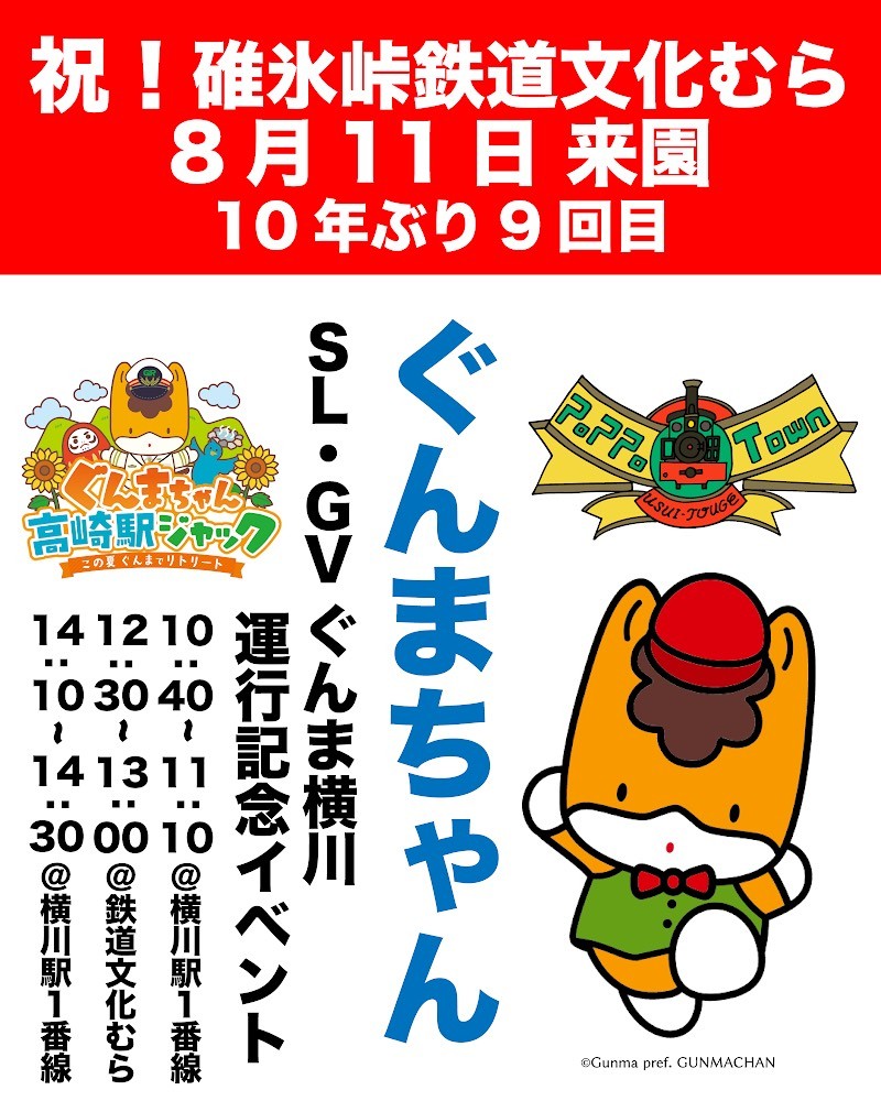イベント情報 TOPイベント情報SL・GVぐんま横川 運行記念イベント】開催! カテゴリー > すべてのカテゴリーボランティア活動イベント情報 アーカイブ > すべて 2025年12月 2025年10月 2025年9月 2025年8月 2025年7月 2025年6月 2025年5月 2025年4月 2025年3月 2025年2月 2025年1月 2024年12月 2024年11月 2024年10月 2024年9月 2024年8月 2024年7月 2024年6月 2024年5月 2024年4月 2024年3月 2024年2月 2023年12月 2023年11月 2023年10月 2023年9月 2023年8月 2023年7月 2023年6月 2023年5月 2023年4月 2023年3月 2023年2月 2023年1月 2022年11月 2022年10月 2022年9月 2022年8月 2022年7月 2022年6月 2022年5月 2022年4月 2022年3月 2022年2月 2022年1月 2021年12月 2021年11月 2021年10月 2021年9月 2021年8月 2021年7月 2021年4月 2020年10月 2020年9月 2020年8月 2020年7月 2020年6月 2020年1月 2019年12月 2019年11月 2019年10月 2019年9月 2019年8月 2019年7月 2019年6月 2019年5月 2019年4月 2019年3月 2019年2月 2019年1月 2018年12月 2018年11月 2018年10月 2018年9月 2018年8月 ■2025年08月 2025.08.01 / イベント情報 SL・GVぐんま横川 運行記念イベント】開催! 2025年8月11日(月)「SL・GVぐんま横川」運行! 横川駅と碓氷峠鉄道文化むらに『ぐんまちゃん』がやってきます! ぐんまちゃん高崎駅ジャックとあわせて、お楽しみください。皆様のご来園をお待ちしております。 前の記事次の記事 一覧に戻る