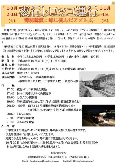 9月30日(日)開催予定で台風のため10月20日(土)に延期となった夜行トロッコですが、まだまだ参加者を募集しています。皆様のお申し込みをお待ちしております!