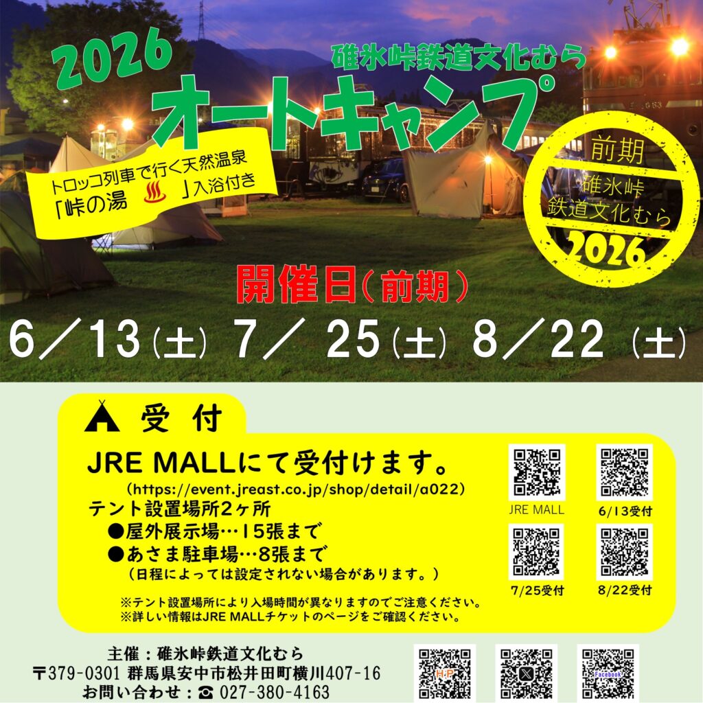 イベント情報 TOPイベント情報キャンプイベント開催!(2026前期) カテゴリー > すべてのカテゴリーボランティア活動イベント情報 アーカイブ > すべて 2026年4月 2026年3月 2026年2月 2025年12月 2025年10月 2025年9月 2025年8月 2025年7月 2025年6月 2025年5月 2025年4月 2025年3月 2025年2月 2025年1月 2024年12月 2024年11月 2024年10月 2024年9月 2024年8月 2024年7月 2024年6月 2024年5月 2024年4月 2024年3月 2024年2月 2023年12月 2023年11月 2023年10月 2023年9月 2023年8月 2023年7月 2023年6月 2023年5月 2023年4月 2023年3月 2023年2月 2023年1月 2022年11月 2022年10月 2022年9月 2022年8月 2022年7月 2022年6月 2022年5月 2022年4月 2022年3月 2022年2月 2022年1月 2021年12月 2021年11月 2021年10月 2021年9月 2021年8月 2021年7月 2021年4月 2020年10月 2020年9月 2020年8月 2020年7月 2020年6月 2020年1月 2019年12月 2019年11月 2019年10月 2019年9月 2019年8月 2019年7月 2019年6月 2019年5月 2019年4月 2019年3月 2019年2月 2019年1月 2018年12月 2018年11月 2018年10月 2018年9月 2018年8月 ■2026年04月 2026.04.24 / イベント情報 キャンプイベント開催!(2026前期) 展示車両の周りでテントを張ってお泊まりできるキャンプイベントを開催します。詳細・お申込はJRE MALLからとなっておりますので、皆様のお申込をお待ちしております。 https://event.jreast.co.jp/shop/detail/a022 6月13日(土)のお申し込みはこちら→ 6月13日(土)7月25日(土)のお申し込みはこちら→ 7月25日(土)8月22日(土)のお申し込みはこちら→ 8月22日(土) 前の記事 一覧に戻る