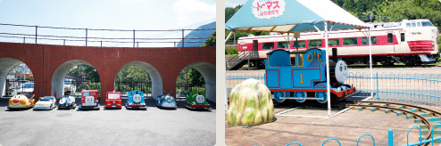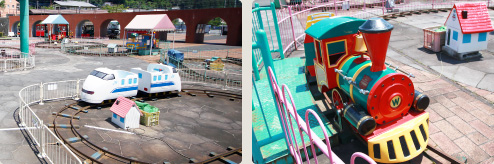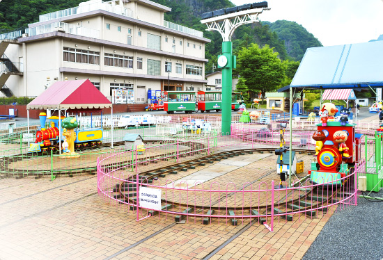 ゲートを抜け「あぷとくん」の高架橋をくぐればそこにはPoppoタウンの多彩なイベント会場となるシンボル広場。4人乗りの手こぎトロッコで楽しく遊べます。アプト式電気機関車の歯車を思わせる石張りや、中心にはEF63とあさま号のモニュメントを乗せた時計塔があり、過去から未来へ、歴史の継承を象徴するかのように、Poppoタウンの“時”を告げています。