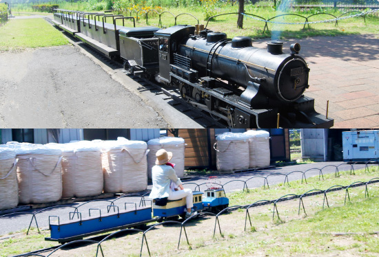 炭水車と客車を連結した5インチゲージの蒸気機関車が、1周約300mの軌道をチビッ子達や大人も乗せて走ります。(雨天も運転)