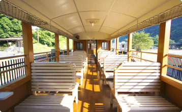 列車編成の先端は前面に展望スペースのある窓ガラスのない(冬季はアクリル板つき)オープンタイプの客車です。50名乗る事ができます。
