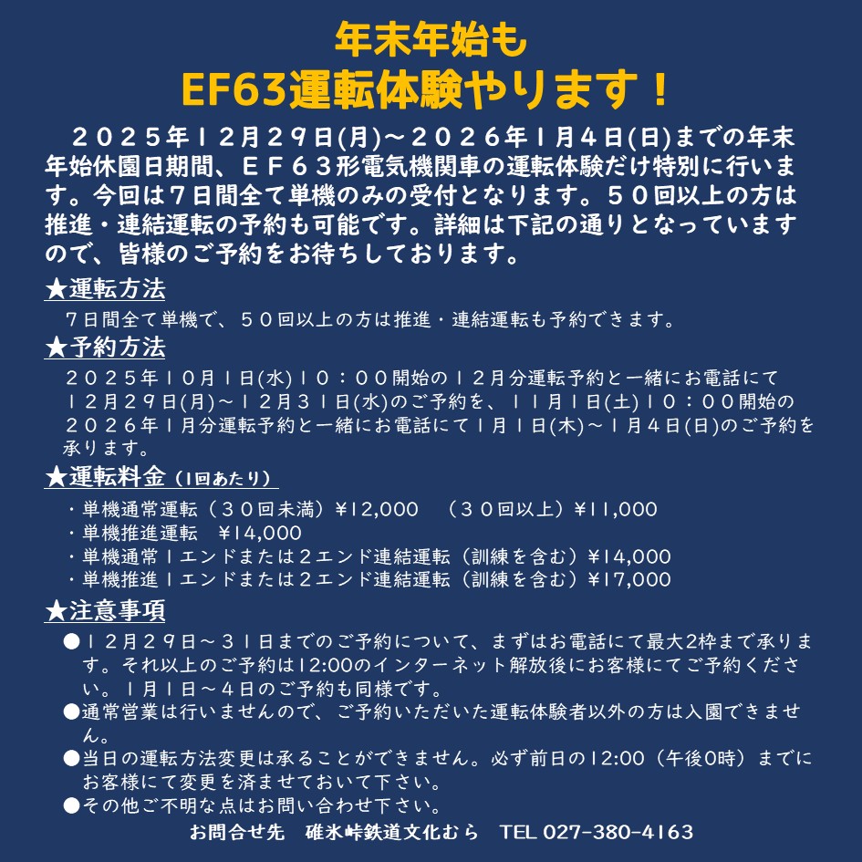 2025年12月29日(月)~2026年1月4日(日)まで、碓氷峠鉄道文化むらは休園いたします。この休園期間中、EF63形電気機関車の運転体験のみ行います。運転体験者以外の方は入園できませんがご了承下さい。