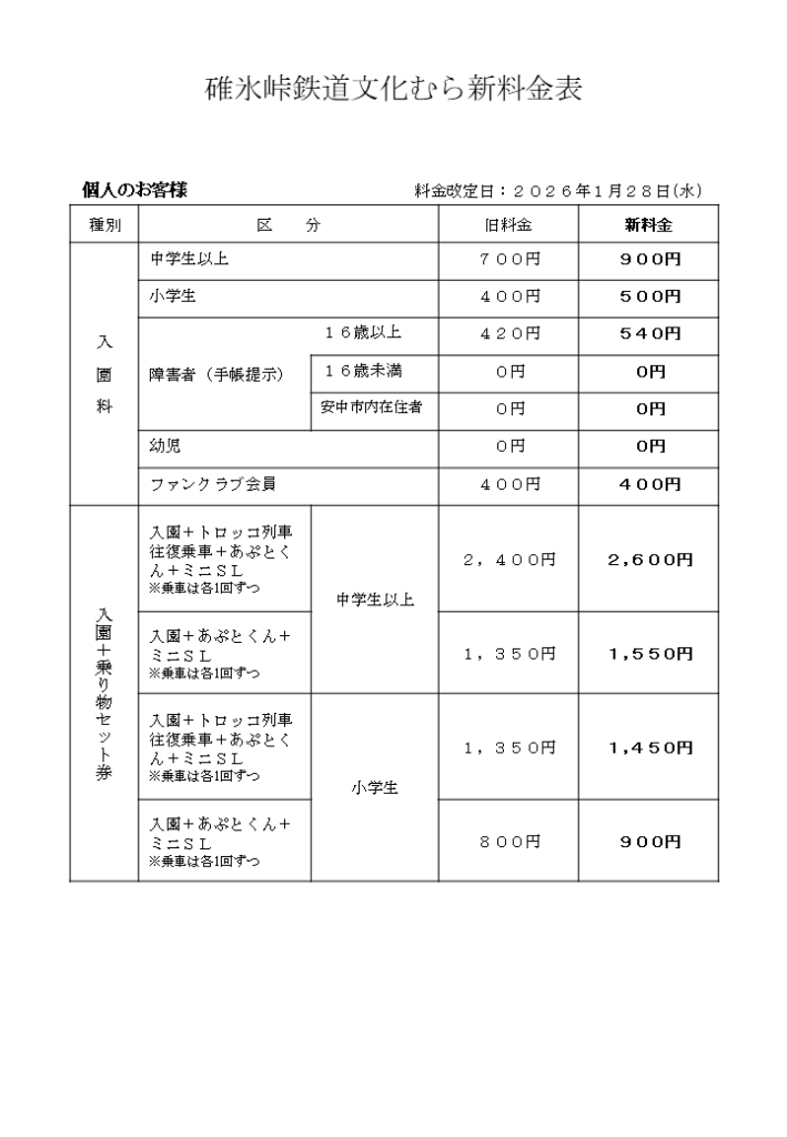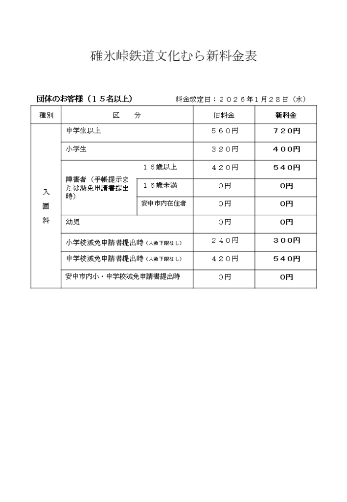 碓氷峠鉄道文化むらは2022年10月に料金改定を行いましたが、昨今の原材料価格等の上昇により、施設維持のため更なる値上げに踏み切らなければならなくなりました。2026年1月28日(水)より、入園料金を値上げさせていただきますが、入園料以外の乗車料金は値上げいたしません。今後も碓氷峠鉄道文化むらの運営を維持しつつ展示車両の修繕とEF63形電気機関車の動態保存を続けて参りたいと思いますので、皆様のご理解を賜りたいと存じます。皆様にお楽しみいただけるイベント等を計画して参りますので、今後ともご愛顧の程よろしくお願い申し上げます。