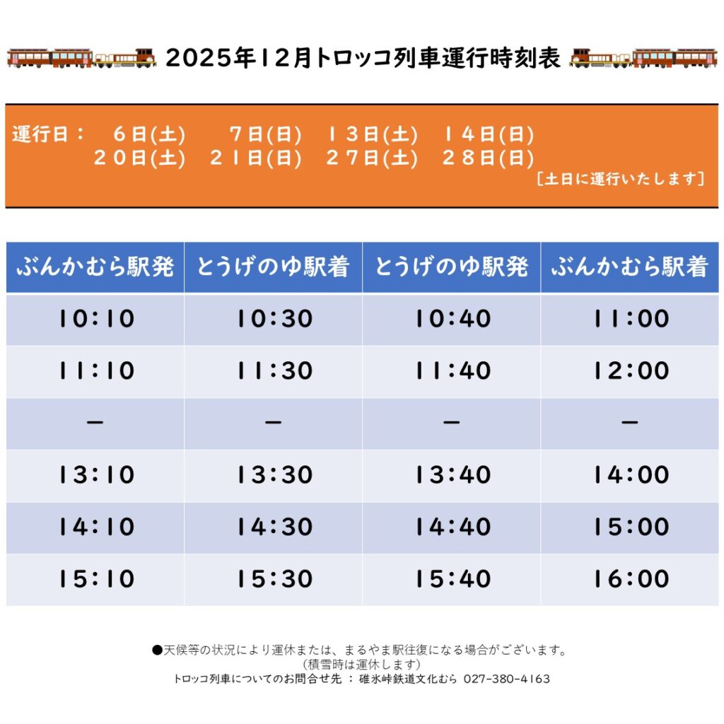 お知らせ TOPお知らせ2025年12月のトロッコ列車運行日について カテゴリー > すべてのカテゴリー未分類イベントおしらせ アーカイブ > すべて 2025年12月 2025年11月 2025年10月 2025年9月 2025年8月 2025年7月 2025年6月 2025年5月 2025年4月 2025年3月 2025年2月 2025年1月 2024年12月 2024年11月 2024年10月 2024年9月 2024年8月 2024年7月 2024年6月 2024年5月 2024年4月 2024年3月 2024年2月 2024年1月 2023年12月 2023年11月 2023年10月 2023年9月 2023年8月 2023年7月 2023年6月 2023年5月 2023年4月 2023年3月 2023年2月 2023年1月 2022年12月 2022年11月 2022年10月 2022年9月 2022年8月 2022年7月 2022年6月 2022年5月 2022年4月 2022年3月 2022年1月 2021年12月 2021年9月 2021年8月 2021年7月 2021年6月 2021年5月 2021年4月 2021年3月 2021年2月 2021年1月 2020年12月 2020年11月 2020年10月 2020年9月 2020年8月 2020年7月 2020年6月 2020年5月 2020年4月 2020年2月 2020年1月 2019年12月 2019年11月 2019年10月 2019年9月 2019年4月 2019年3月 2019年2月 2019年1月 2018年12月 2018年11月 2018年9月 2018年8月 2018年7月 2018年4月 2017年11月 2017年3月 2017年1月 2016年2月 2016年1月 2015年12月 2015年9月 2015年8月 2015年5月 2015年4月 2012年12月 2012年8月 ■2025年12月 2025.12.05 / おしらせ 2025年12月のトロッコ列車運行日について 例年12月~2月までトロッコ列車を運休していましたが、今年度は運行いたします。2025年12月の運行予定日は、土日を予定しています。ご来園の際はぜひご乗車下さい。 前の記事 一覧に戻る
