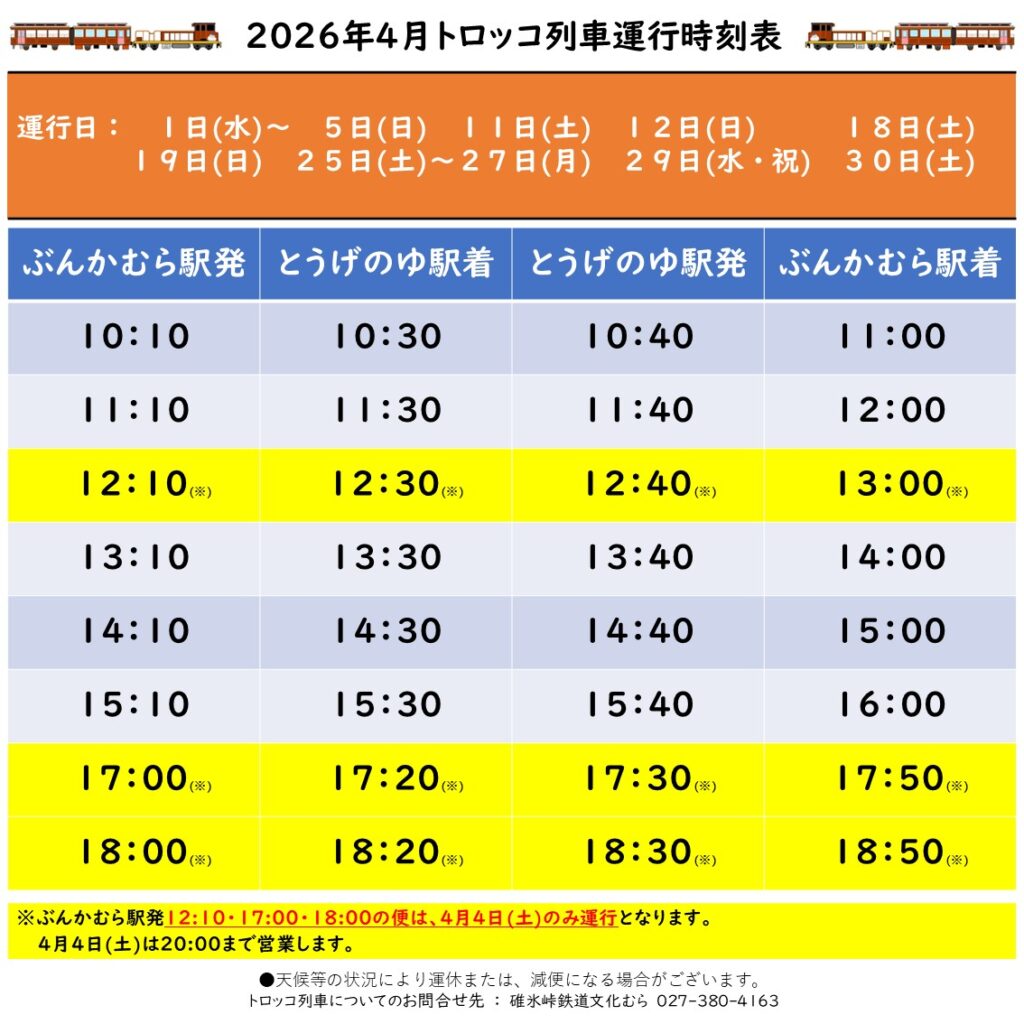 お知らせ TOPお知らせ2026年4月のトロッコ列車運行日について カテゴリー > すべてのカテゴリー未分類イベントおしらせ アーカイブ > すべて 2026年3月 2026年2月 2026年1月 2025年12月 2025年11月 2025年10月 2025年9月 2025年8月 2025年7月 2025年6月 2025年5月 2025年4月 2025年3月 2025年2月 2025年1月 2024年12月 2024年11月 2024年10月 2024年9月 2024年8月 2024年7月 2024年6月 2024年5月 2024年4月 2024年3月 2024年2月 2024年1月 2023年12月 2023年11月 2023年10月 2023年9月 2023年8月 2023年7月 2023年6月 2023年5月 2023年4月 2023年3月 2023年2月 2023年1月 2022年12月 2022年11月 2022年10月 2022年9月 2022年8月 2022年7月 2022年6月 2022年5月 2022年4月 2022年3月 2022年1月 2021年12月 2021年9月 2021年8月 2021年7月 2021年6月 2021年5月 2021年4月 2021年3月 2021年2月 2021年1月 2020年12月 2020年11月 2020年10月 2020年9月 2020年8月 2020年7月 2020年6月 2020年5月 2020年4月 2020年2月 2020年1月 2019年12月 2019年11月 2019年10月 2019年9月 2019年4月 2019年3月 2019年2月 2019年1月 2018年12月 2018年11月 2018年9月 2018年8月 2018年7月 2018年4月 2017年11月 2017年3月 2017年1月 2016年2月 2016年1月 2015年12月 2015年9月 2015年8月 2015年5月 2015年4月 2012年12月 2012年8月 ■2026年03月 2026.03.31 / おしらせ 2026年4月のトロッコ列車運行日について 2026年4月の運行予定日は下記の通りです。4月4日(土)は鉄道ファン感謝DAYイベント開催のため、夕暮れトロッコを運行します。ご来園の際はぜひご乗車下さい。 前の記事 一覧に戻る