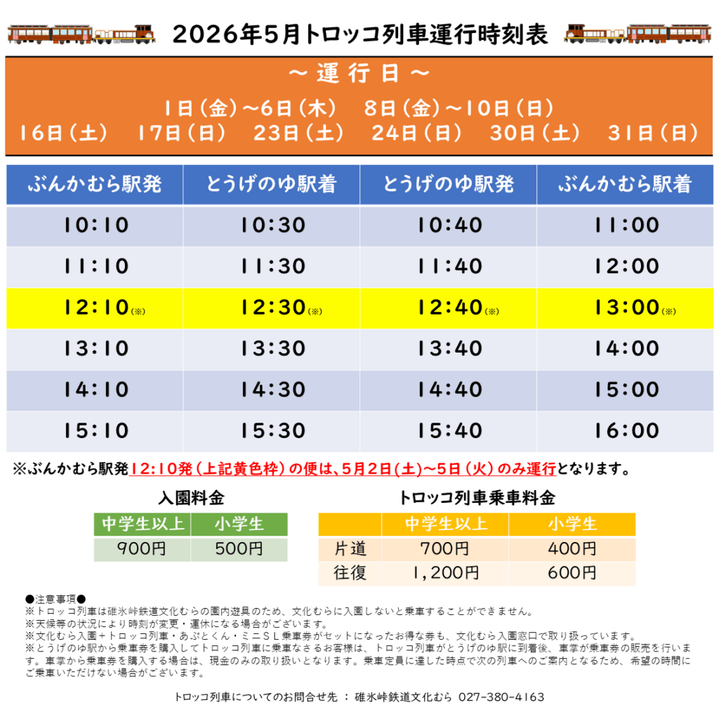 お知らせ TOPお知らせ2026年5月のトロッコ列車運行日について カテゴリー > すべてのカテゴリー未分類イベントおしらせ アーカイブ > すべて 2026年4月 2026年3月 2026年2月 2026年1月 2025年12月 2025年11月 2025年10月 2025年9月 2025年8月 2025年7月 2025年6月 2025年5月 2025年4月 2025年3月 2025年2月 2025年1月 2024年12月 2024年11月 2024年10月 2024年9月 2024年8月 2024年7月 2024年6月 2024年5月 2024年4月 2024年3月 2024年2月 2024年1月 2023年12月 2023年11月 2023年10月 2023年9月 2023年8月 2023年7月 2023年6月 2023年5月 2023年4月 2023年3月 2023年2月 2023年1月 2022年12月 2022年11月 2022年10月 2022年9月 2022年8月 2022年7月 2022年6月 2022年5月 2022年4月 2022年3月 2022年1月 2021年12月 2021年9月 2021年8月 2021年7月 2021年6月 2021年5月 2021年4月 2021年3月 2021年2月 2021年1月 2020年12月 2020年11月 2020年10月 2020年9月 2020年8月 2020年7月 2020年6月 2020年5月 2020年4月 2020年2月 2020年1月 2019年12月 2019年11月 2019年10月 2019年9月 2019年4月 2019年3月 2019年2月 2019年1月 2018年12月 2018年11月 2018年9月 2018年8月 2018年7月 2018年4月 2017年11月 2017年3月 2017年1月 2016年2月 2016年1月 2015年12月 2015年9月 2015年8月 2015年5月 2015年4月 2012年12月 2012年8月 ■2026年04月 2026.04.22 / おしらせ 2026年5月のトロッコ列車運行日について 2026年5月のトロッコ列車運行予定日は下記の通りです。5月2日(土)~5日(火)まではお昼も増便もいたしますので、新緑の碓氷峠を満喫できるトロッコ列車にぜひご乗車下さい! 前の記事次の記事 一覧に戻る